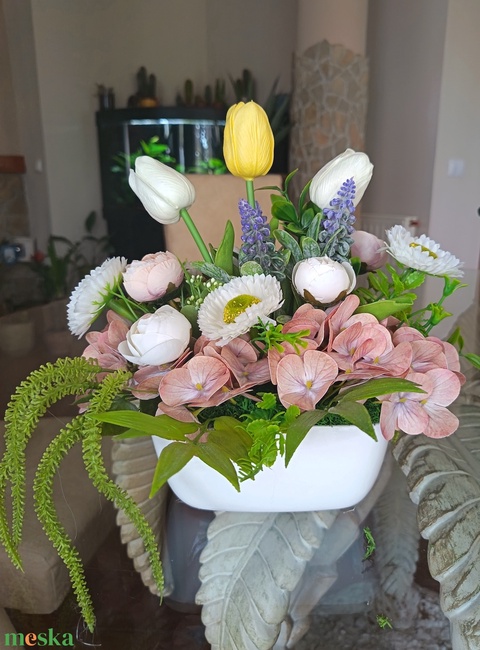 - Anyag/Összetevő kerámiakaspó, tűzőhab, prémium minőségű örökvirágok