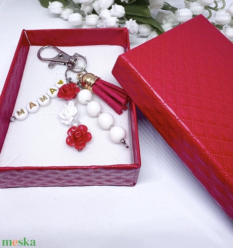 Egyedi "MAMA" feliratos kulcstartó bordó bojtos díszítéssel piros