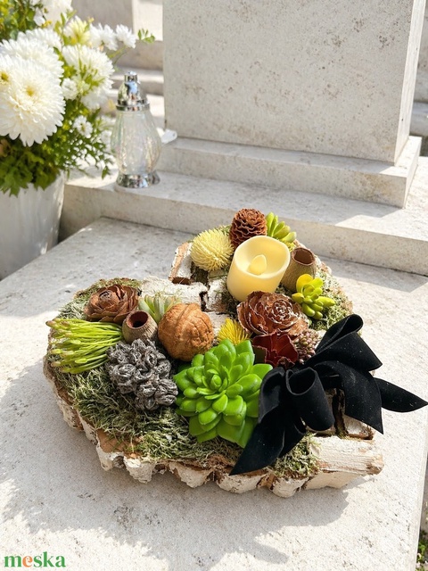 Sírdísz csodás selyem és szárazvirágokból ledes mécsessel