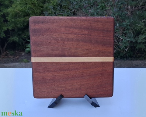 Afrikai sapelli magóni és juhar fafajokból válogatott, egyedileg készített vágódeszka, vízálló ragasztással, vegytisztaságú Biopin keményolajjal kezelve. Hátoldalán csúszásmentes gumitalpacskákkal ellátva.