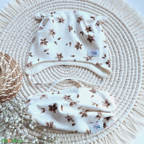 Kötős gyerek sapka csősál szett, barna virágok, LuannaBaby