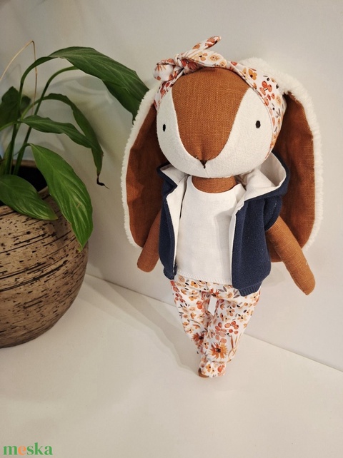 Nyuszi lány, virágos naciban és kapucnis kabátkában - kézműves gyerekjáték, öltöztethető játékfigura