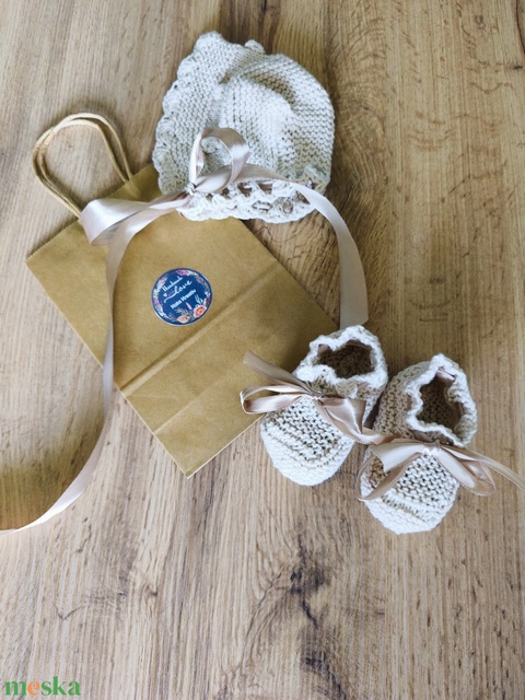 Újszülött ajándék kézzel kötött pamut sapka és kis cipő