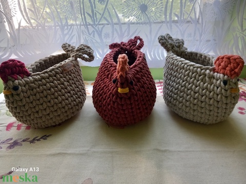 Újrahasznosított pamut zsinórfonalból készült. Cuki tyúk formajú tároló 😊 kávékapszula tartónak is tökéletes. Kedves ajándék is lehet☺️