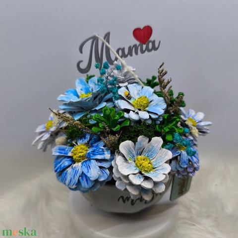 Kézzel festett tobozvirág-dísz kerámia tálban – kék – „Anya" / „Mama" felirattal, anyáknapi ajándék