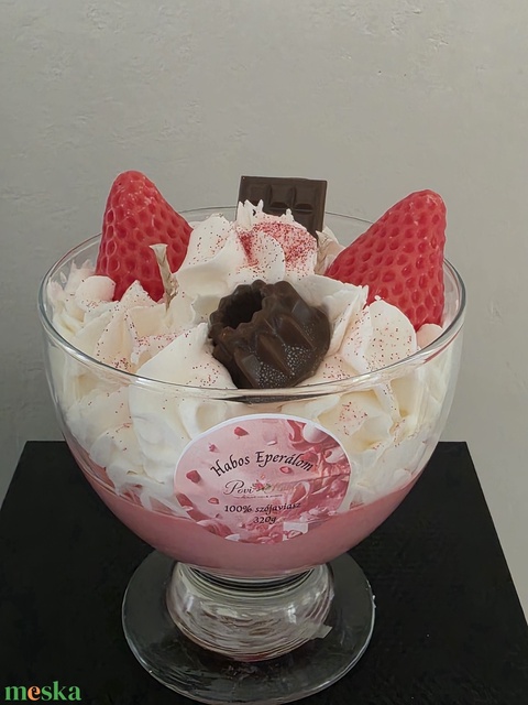 Engedd, hogy elvarázsoljon a „Habos Eperálom” desszertgyertyánk, amely az eper édes illatát és a csokoládé csábítását hozza el otthonodba! Ez a nem mindennapi alkotás nemcsak egy gyertya, hanem egy igazi, látványos lakásdekorációs elem, ami garantáltan a szoba ékköve lesz.