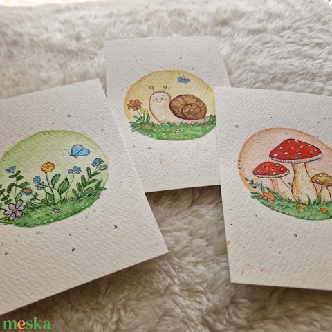 Tavaszi mesés képszett – csigás, virágos és gombás akvarell képsorozat