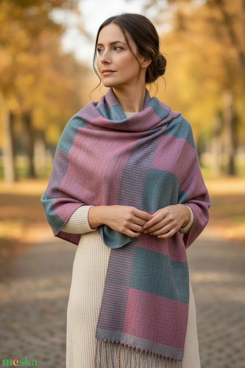 Kézzel szőtt rövidebb málna, rózsaszín csíkos selyemsál