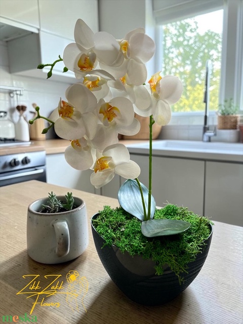 Örök fehér orchidea kompozíció sötétszürke kaspóban