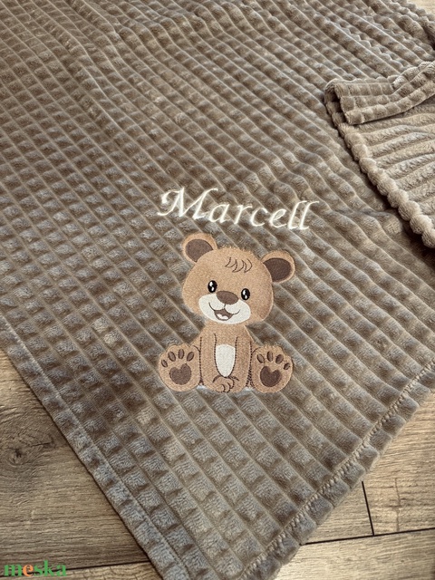 Hímzett egyrétegű babatakaró , maci-fiú mintával, névre szóló, barna színben