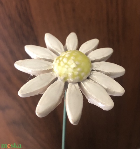 Fehér agyagból, kézzel készült, mázas virágdísz. Barack, sárga és fehér színekben. Drótra ragasztotta. Készülhet belőle csokor, asztaldísz, de ha csak önmagában vázába teszed örök dísze az otthonodnak, növény mellé tűzve is szépen mutat.