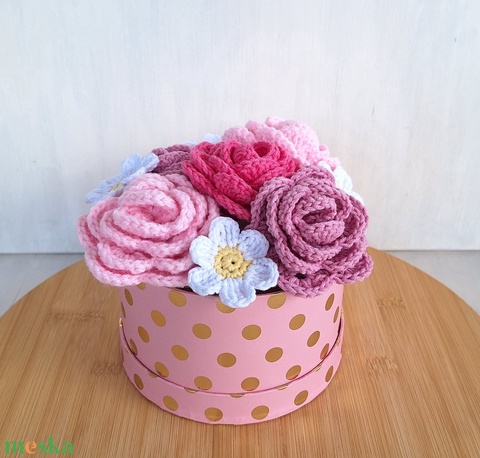 Rózsabox- Virágdoboz horgolt rózsákkal és margarétákkal