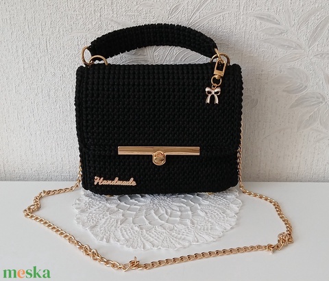 - Anyag/Összetevő 2 mm-es műszálas zsinórfonal, fekete selyem bélés, arany színű kiegészítők