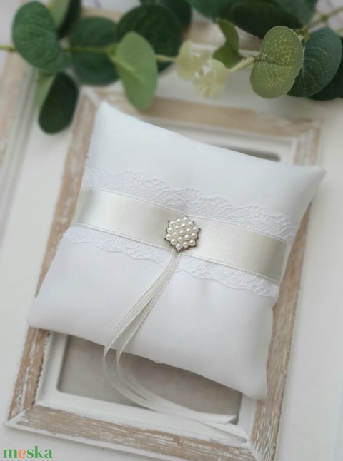 Gyűrűpárna "EMILY", szatén gyűrűtartó, csipkével és brossal