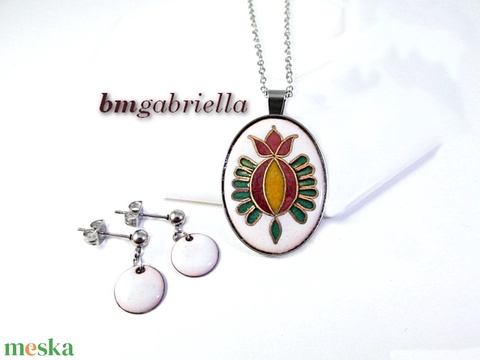 Nyíló tulipán ékszerszett- egyedi tűzzománc nyaklánc és fehér, lógós fülbevaló
