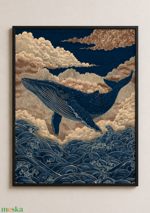 Bálna a hullámok között falikép – művészi, vintage hangulatú poszter, 42 × 30 cm