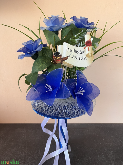 Ballagási emlék – kék örökcsokor bagollyal, egyedi ajándék