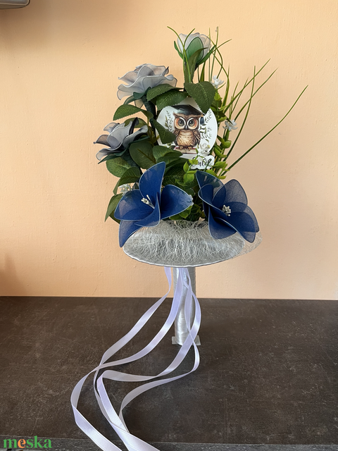 Ballagási virágdísz bagoly motívummal – kék-fehér örökcsokor általános és középiskolásoknak