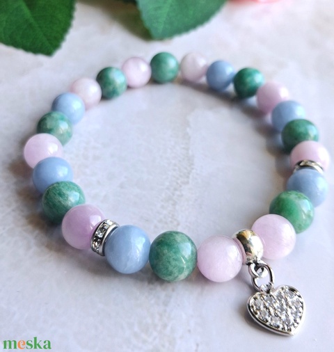 A kunzit, az orosz amazonit és az angelit lágy pasztellszínei harmonikus, nőies összhangot teremtenek ebben a különleges ásványkarkötőben. Finom megjelenését a csillogó szív medál teszi még elegánsabbá, így egyszerre romantikus és letisztult kiegészítő a mindennapokra.