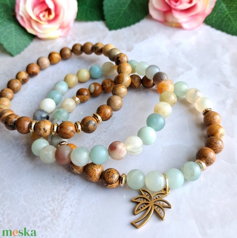 A képjáspis és multicolor amazonit karkötők harmonikus kombinációja természetes, mégis különleges megjelenést ad ennek a háromrészes szettnek. A meleg, földes árnyalatok és a lágy pasztell tónusok kiegyensúlyozott összhatást alkotnak, így együtt és külön viselve is stílusos választás.
