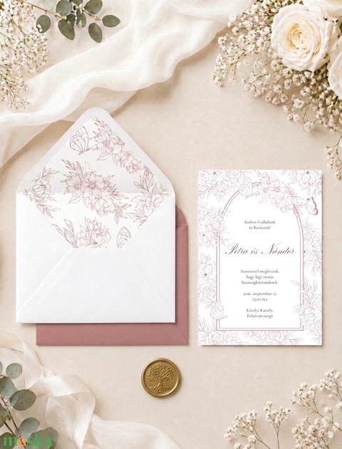 Mályva Botanika – Elegáns púder árnyalatú virágos esküvői meghívó, bélelt borítékkal és viaszpecséttel.