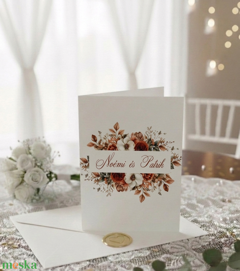 A szövegezést teljesen a Ti igényeitekre szabjuk (név, dátum, helyszín, szöveg). A grafika a képen látható meleg terrakotta, rozsda és púder árnyalatú virágokkal készül.