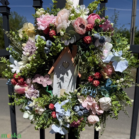 - Anyag/Összetevő selyemvirágok és zöldek, szalaggal bevont szalma koszorú, fa házikó