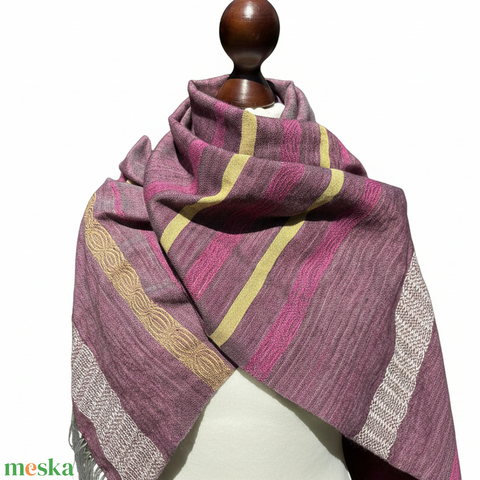 Romantikus, kézzel szőtt merinó–selyem–jak kendő – aszimmetrikus lila sál – egyedi kézműves darab