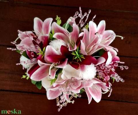 - Anyag/Összetevő virágtáska, rózsaszín liliom, lila liliom, eukaliptusz, zöld levelek, rózsa, akrilgyöngyök, gombócvirág