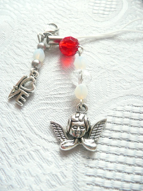 mobil fityegő, tibeti ezüst angyal, minőségi üveggyöngy, swarovski