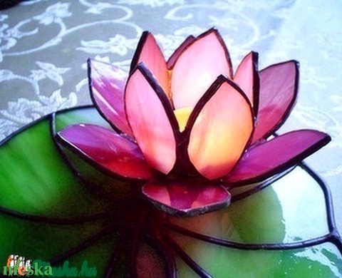 - Anyaga: wissmach üveg rózsaszín, wissmach üveg zöld, ón ólom ötvözet forraszanyag, réz fólia, patina, üveggyöngy, u ólomprofil, lakk, kétkomponensű ragasztó