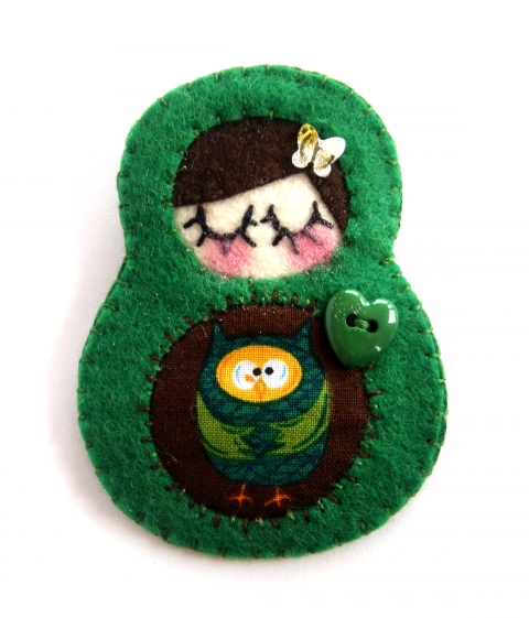 filc, hímző fonal, biztonsági kitűző kapocs, swarovski kristály, baglyostextil, szív gomb