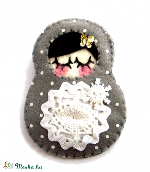 pöttyös filc, hópihe gomb, swarovski kristály, farkasfog, csipke
