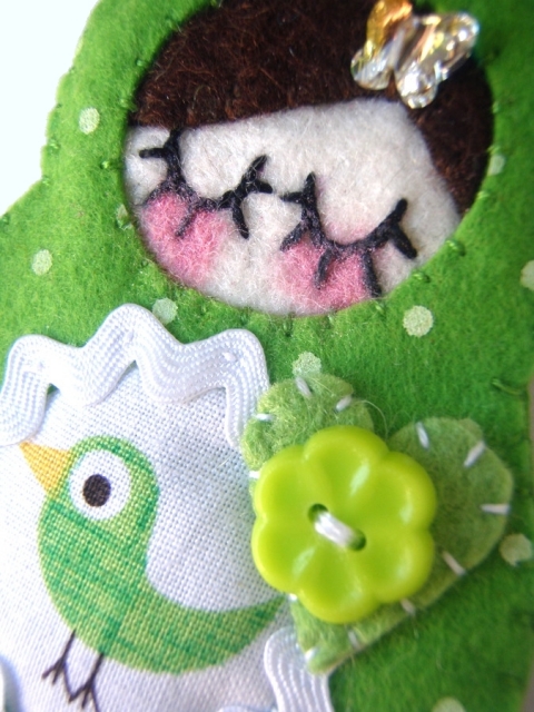 pöttyösfilc, hímző fonal, biztonsági kitűző kapocs, swarovski kristály, madaras textil, farkasfog, virág gomb