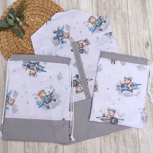 Óvodai Szett 3 db-os - Ruhazsák, tornazsák és tisztasági zsák "kék repülős maci"- szürke Eladva Rendelj Te is!
